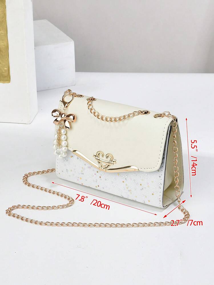 This elegant small square bag features a flap closure adorned with a delicate bow and faux pearl embellishments, combining classic charm with modern style. Crafted from durable PU leather in a versatile beige tone, it offers a colorful, geometric, and letter-patterned all-over print for a casual yet refined look. The chain strap is adjustable, providing comfortable wear for everyday shopping or outings. Its compact design makes it an ideal gift choice for Mother's Day or birthdays, blending practicality with sophisticated fashion effortlessly.
