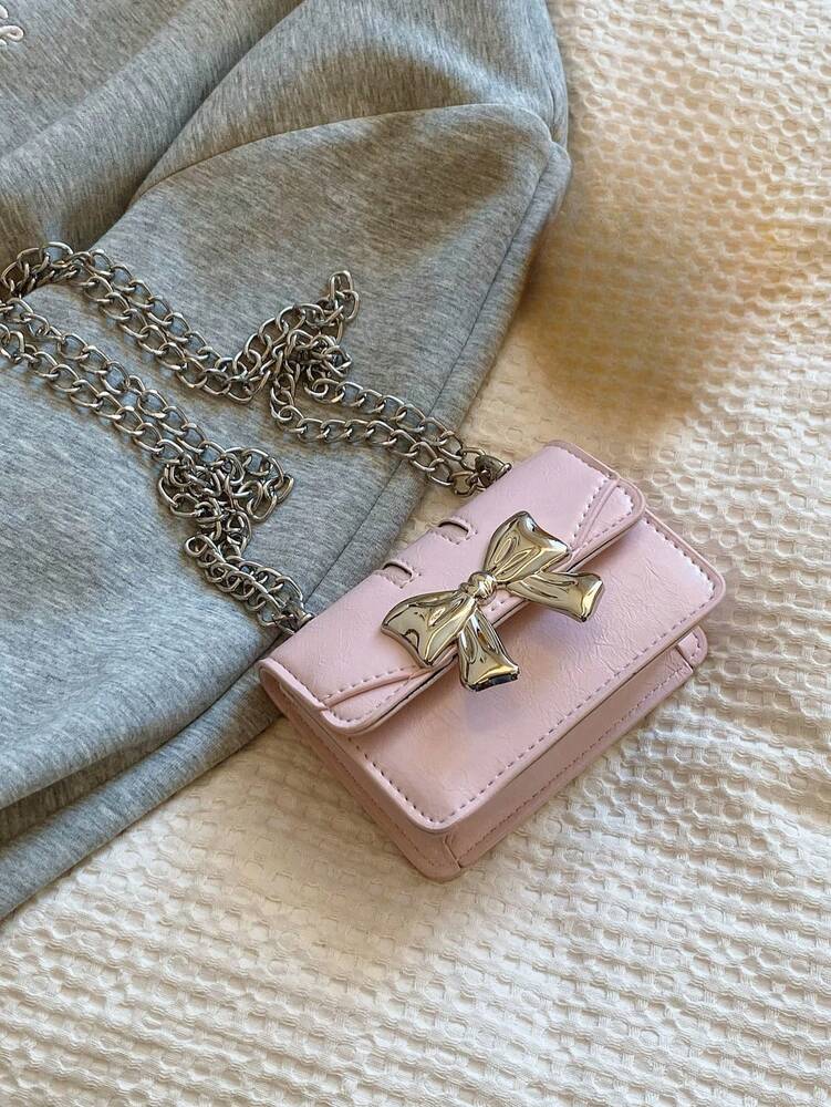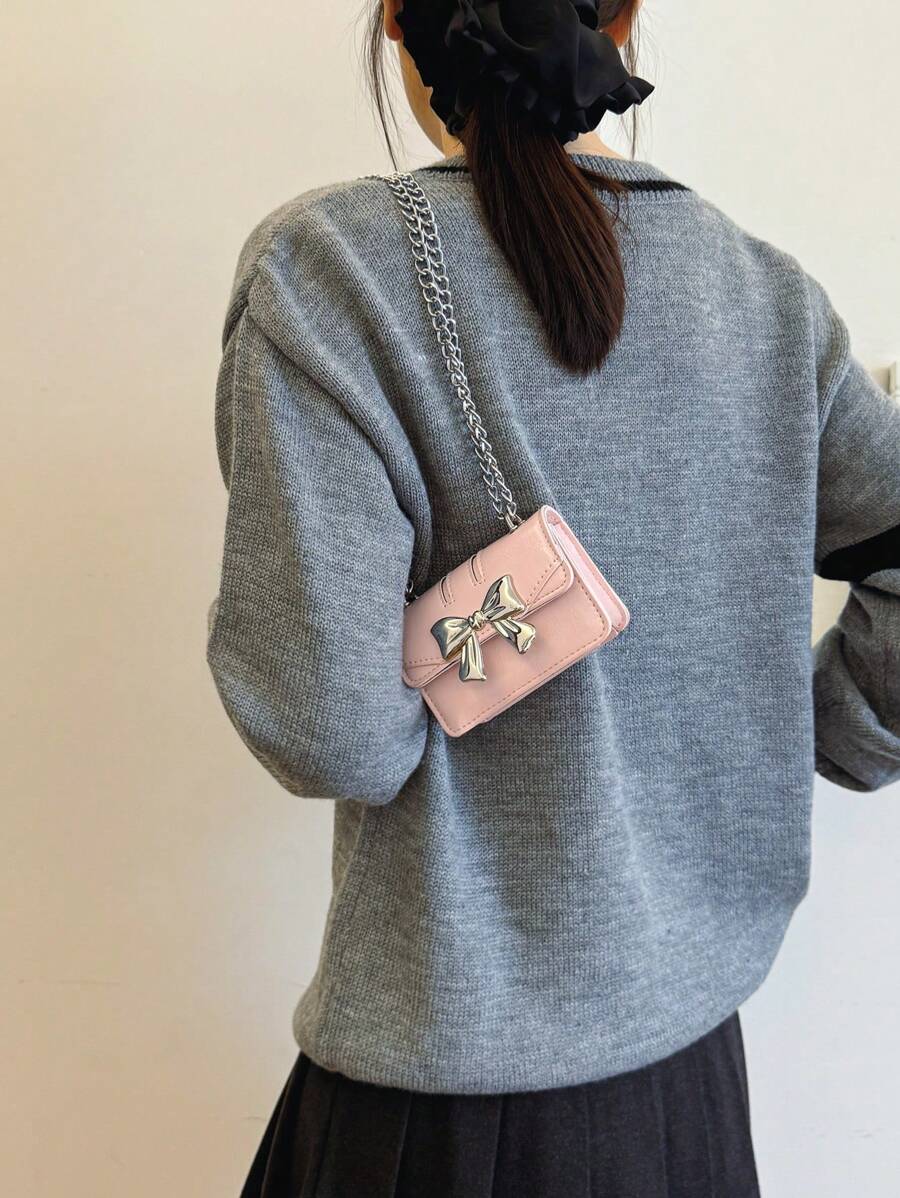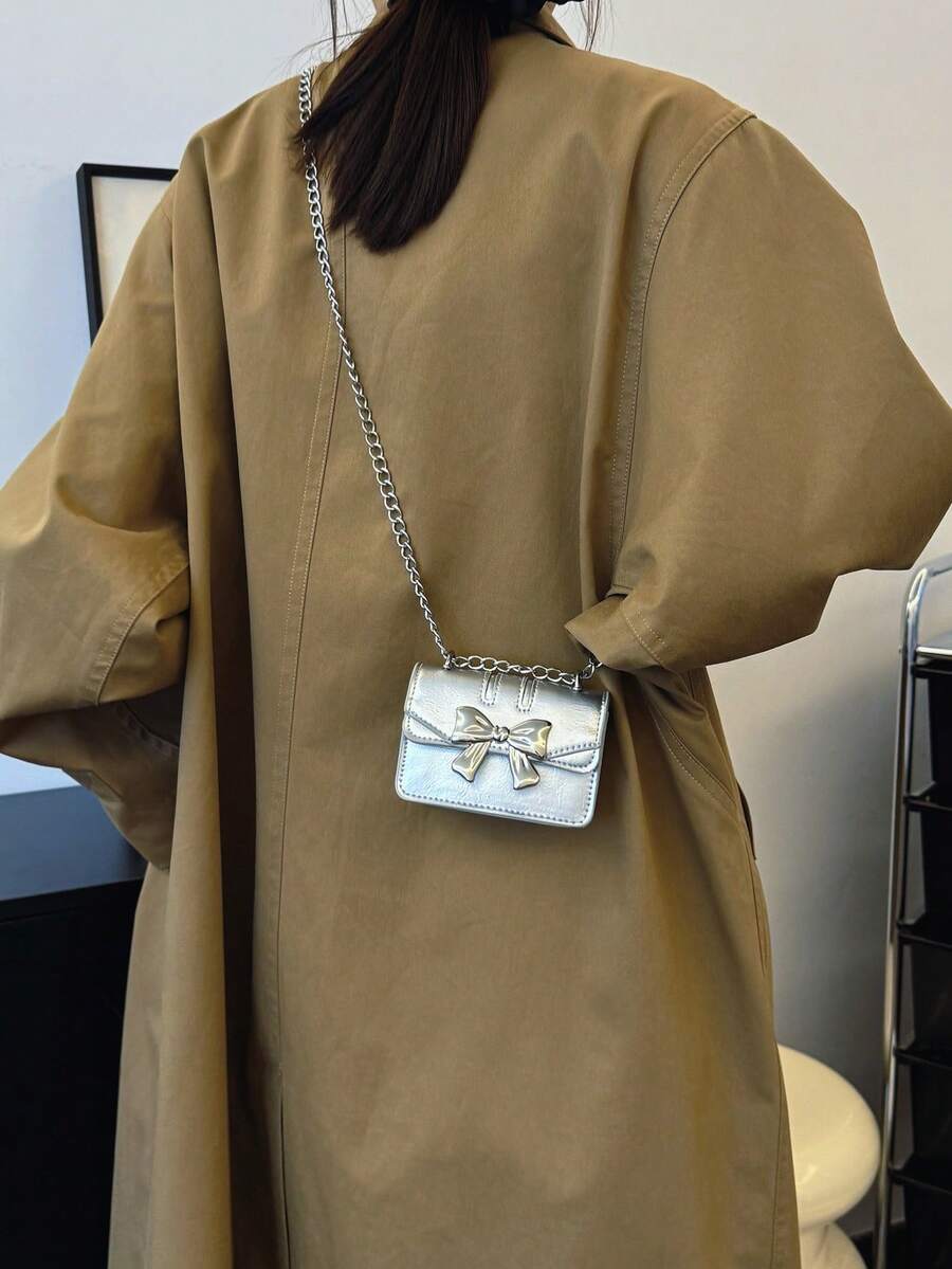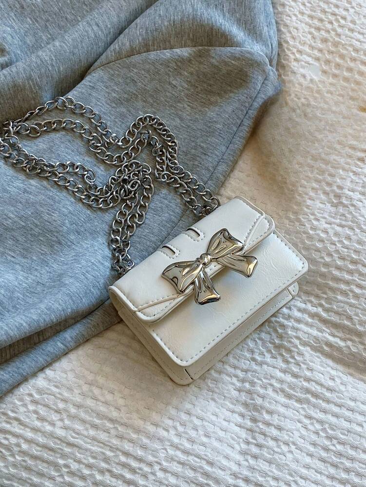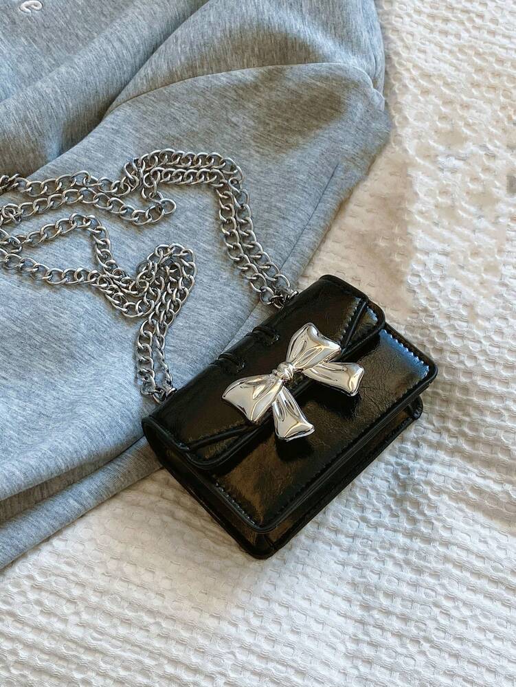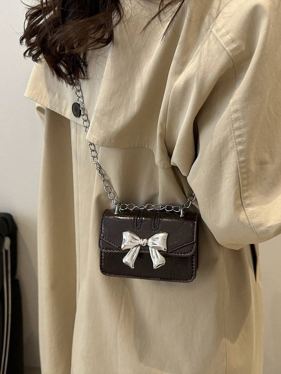 Fashionable Mini Square Crossbody Bag with Bow Decoration and Double Chain, Ideal for Fall and Winter, Lightweight Daily Purse for Students and Women